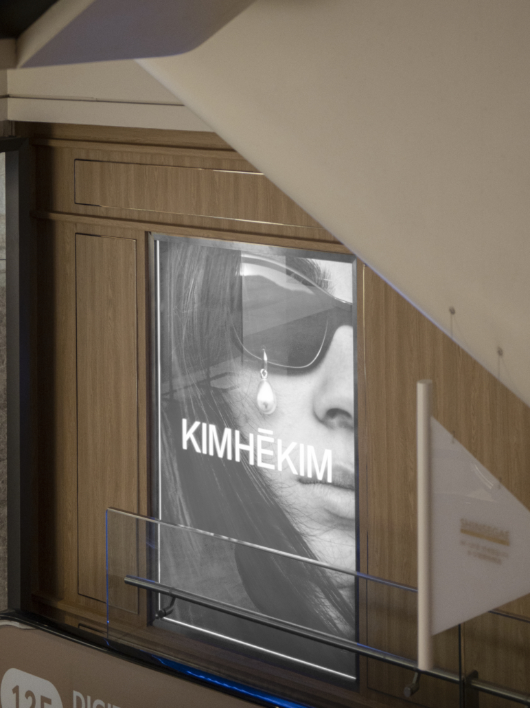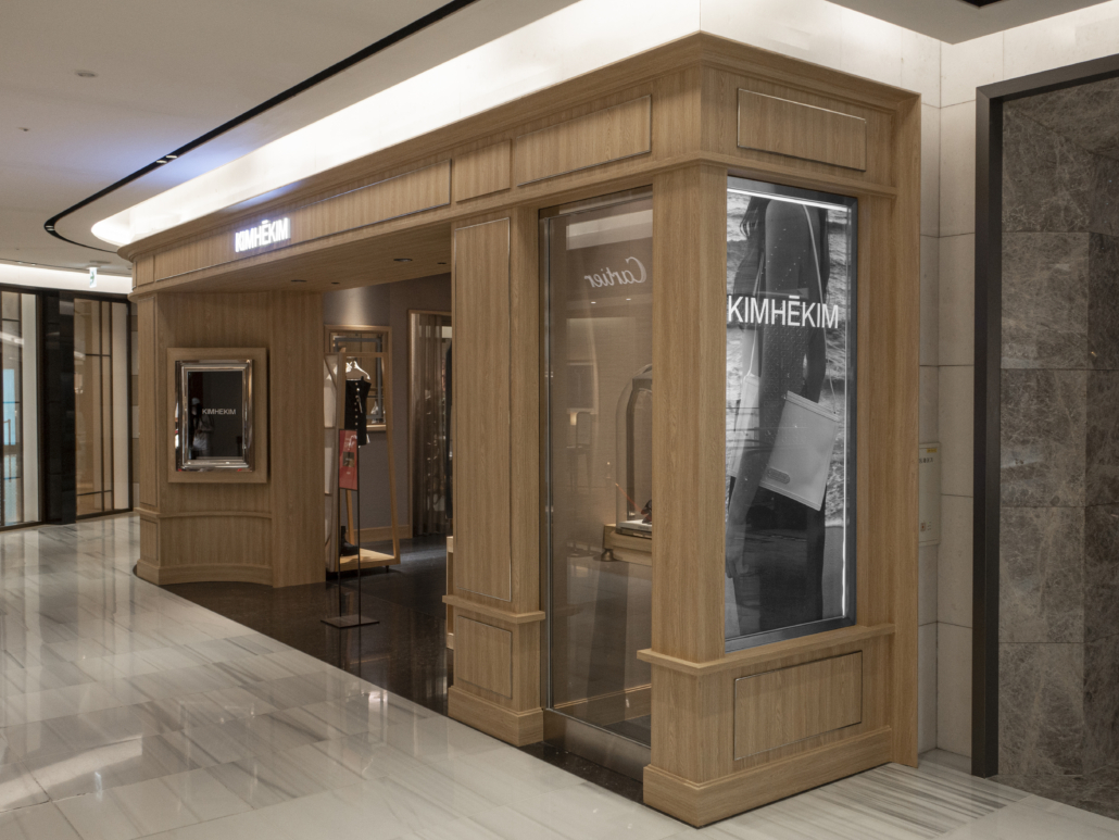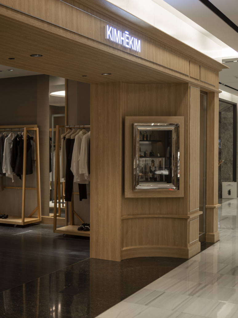 김해김 스토어 신세계 본점은 메종 김해김의 첫 번째 백화점 매장으로 이후 전개될 매장의 기준이 되는 중요한 프로젝트 였습니다. 가야의 장식문화에 영감을 받아 프랑스의 꾸뛰르를 접목시켜 전개하는 김해김의 디자인을 공간의 언어로 번역하는 것에 있어, 우리는 잘 다듬은 클래식한 우드와 자수 위에 그려낸 민화를 주요소로 공간을 구성했습니다.