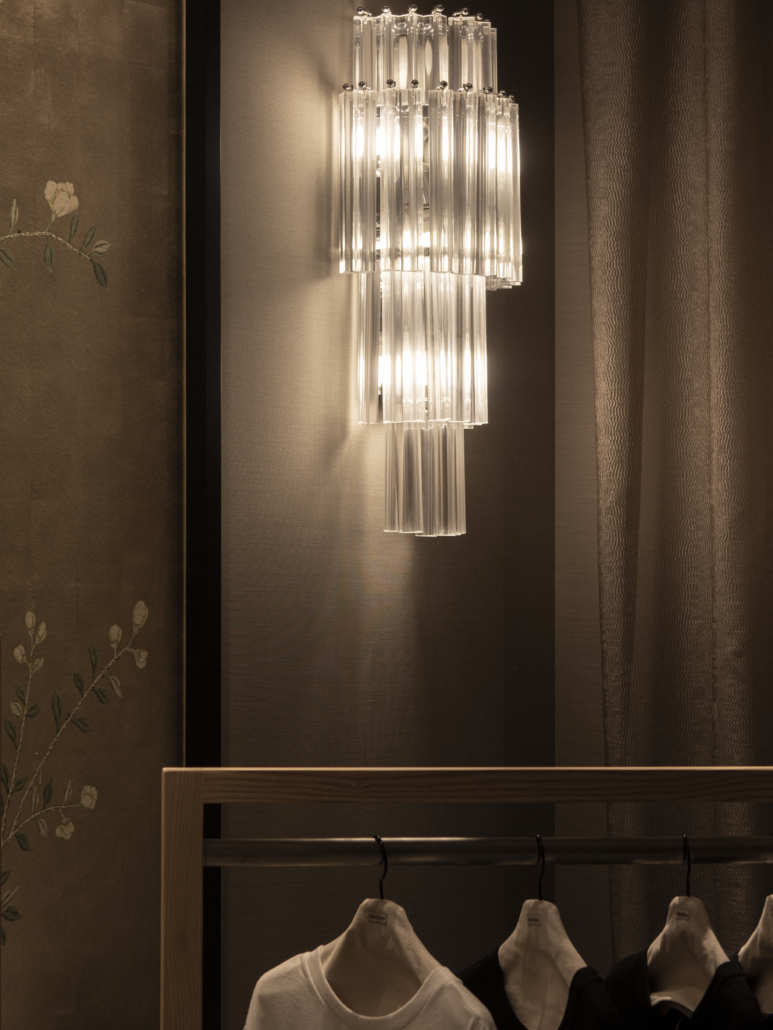 김해김의 옷에 실루엣처럼, 단단한 나무를 유려한 곡선으로 다듬었고, 여백의 그림 앞에는 악세서리가 배치되고 손에 닿을듯 닿을 수 없는 거리감에 두꺼운 크롬 액자를 두어, 깊이를 부여했습니다. 김해김 프로젝트에서 가장 중요하게 생각하는 화려한 옷의 조연이 될 수 있는 단단한 배경을 만드는 것이 이 프로젝트의 목적이었습니다.