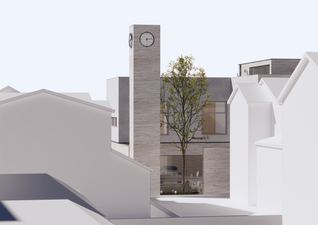 이웃에 대한 우리가 할 수 있는 기여는 무엇일까 생각했습니다. 2층으로 낮은 박공집들이 빼곡히 들어선 이 단지에 방향성을 부여하고 무엇을 공유할 수 있는일을 하고 싶었고, 저희는 시계탑을 계획했습니다. 시계탑은 스틸하우스 단지에 흥미로운 공유재 혹은 이야기가 될 것이라 생각합니다. 아이들은 ‘시계집’이라 불리는 집에서 자랑거리처럼 말할 수 있는 추억을 가질 수 있습니다. 이제, 소중한 가족을 감싸안는 단단한 집을 소개합니다.